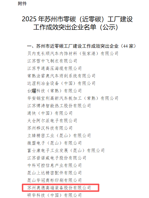 此次成功入选苏州市零碳(近零碳)工厂突出企业名单,是对奥德长期坚持绿色发展的权威认可。展望未来,奥德将继续秉持“节能环保”的核心技术理念,不断探索和创新减碳路径,将自身的成功经验与行业共享,助力产业链上下游协同降碳,为推进新型工业化贡献奥德力量。