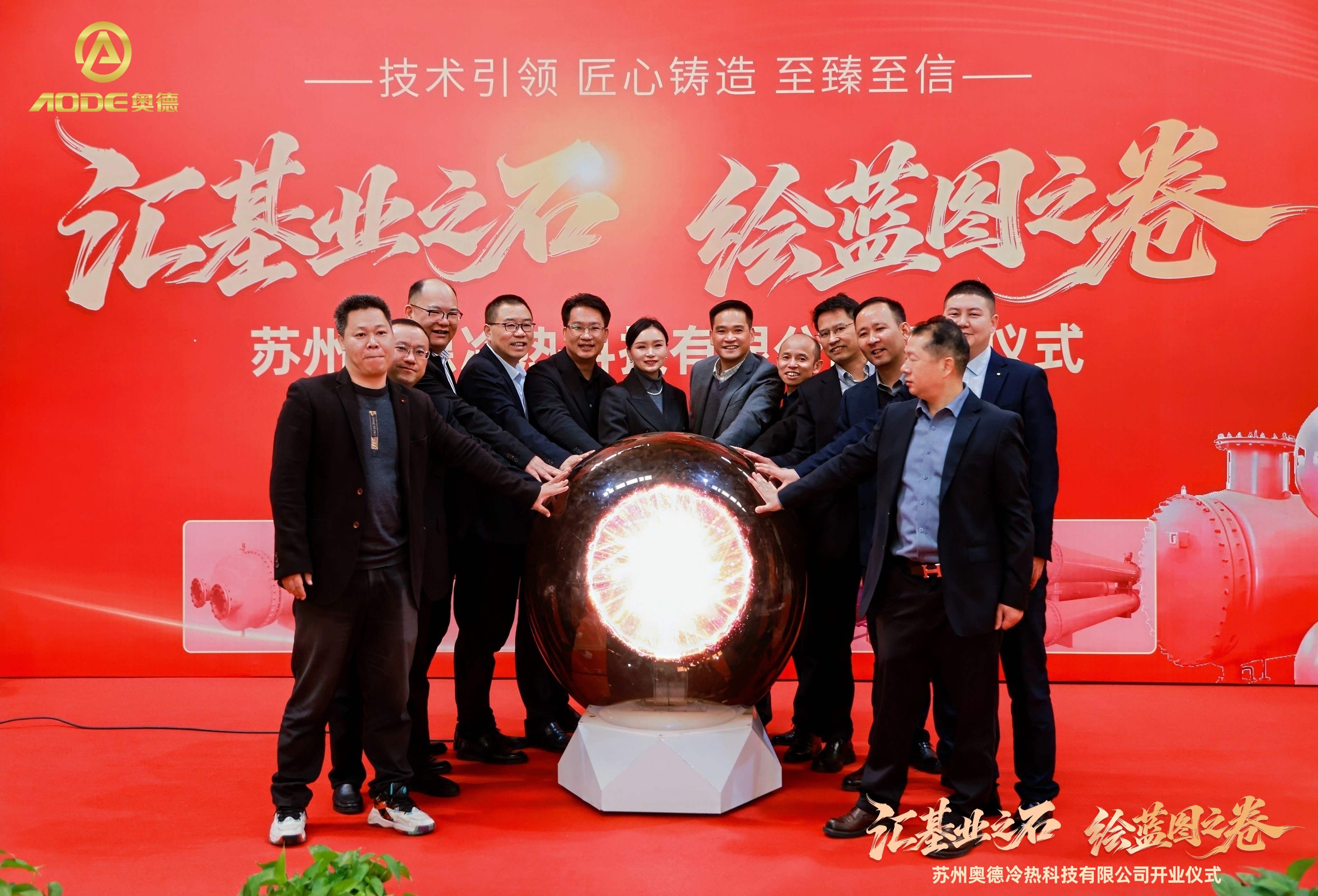 基石落定,12位领导共同将手置于启动球上。随着全场倒数“3、2、1”,启动球瞬间点亮,标志着奥德冷热科技正式起航。