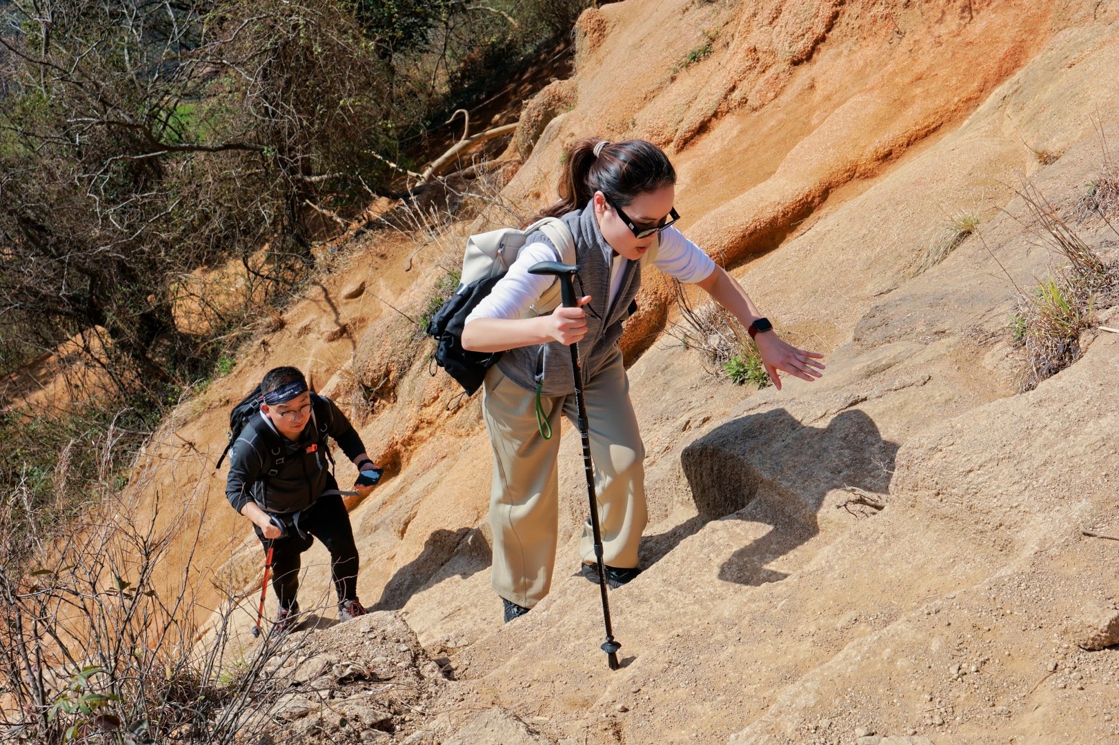 随着一声令下,队伍从灵岩山脚出发,沿着被称为“苏州徒步毕业线路”的灵树线一路向前。这不是一次轻松的春游踏青。山路崎岖,碎石遍布;陡坡连连,上上下下。行至绝望坡时,几乎垂直的石阶让不少人放慢了脚步,大口喘气,连绵起伏的山脊线考验着每个人的耐力极限。