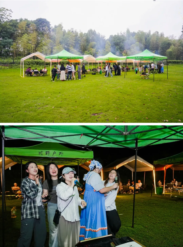 夜幕降临,热闹的篝火晚会准时开启,大家围绕着边吃着烧烤,边载歌载舞,手拉手分享日常趣事,欢快的歌声与笑声在夜空中久久回荡,温暖的氛围将彼此的心紧紧相连。